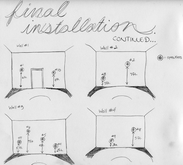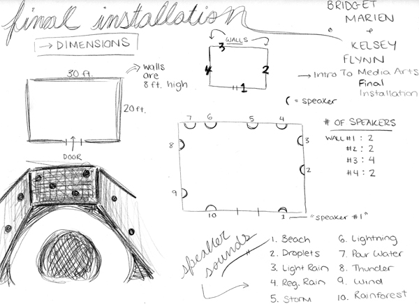 For our final project, we’ve designed an installation piece that plays with the idea of reflection of sound, in a room that is 20’ by 30’ feet, with 8’ tall walls. The wall color is black, while the floor has a white circular path surrounded by the color black. When entering the installation, there are about 10 black speakers sporadically installed, by height, in the black walls. The speakers are each playing different sounds from nature, and being slightly separated, so the viewer can hear each sound by itself. The lighting in the installation space will be spotlights hanging from the white ceiling. There will be a long umbrella holder when entering the installation, and the viewer is to grab and umbrella, open it up, follow the white path and discover how differently the sounds reflect off the umbrella when the umbrella is popped open. There is an attached drawing to where the speakers will be placed on each wall. The white circular path on the floor is 5’ thick and the space surrounding the path is just pure black. There will be 10 different colored umbrellas, the colors will be: red, orange, yellow, green, blue, violet, purple, pink, turquoise and magenta. The installation is giving the people who enter the experience to have a private interaction with the many different sounds that come from nature. When the viewer enters the dark installation, they should hear the soft sounds of nature coming from the many speakers that are scattered around the room. The viewer then picks up an umbrella when they enter. When opening the umbrella the viewer should feel a sense of comfort because of the umbrella’s encompassing effect. They then will start slowly walking around the room and following the white path that is on the ground. Every few steps the viewer will listen to a different sound of nature that will be reflecting into the umbrella. Some sounds might be heard louder than others and might give the listener a more intense reaction. The umbrella, realistically, is used for protecting a person from the wet rain. This installation is allowing the viewer to experience that feeling without all the worries that one goes through when hearing those noises. Hearing the different noises in the umbrella should be comforting to the viewer because the umbrella shields the viewer from the other people that might be walking around the installation so they will be getting a private experience. Also, it shields them from the other sounds happening throughout the room so the viewer will be hearing one sound more than others. When leaving the installation the viewer should feel relaxed and enjoy the many sounds of nature that they experienced.